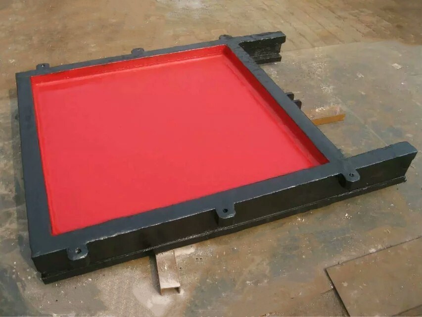 铸铁平板闸门可以做成方形、圆形两种,由门叶和门框两部分组成,门体和门框的材料为铸铁,一般整体铸造、整体加工,门体一般采用面板与加强肋的结构,面板可做平面或拱形。门体一般整体铸造和机加工,但尺寸较大的可采用分块组成式。门体上一般采用整体式金属止水,兼作支承滑块,金属止水用同材料制作的沉头螺钉紧固在门体上,螺钉头部与止水工作面一起精加工,一些尺寸较大的也可“P”形橡皮止水。